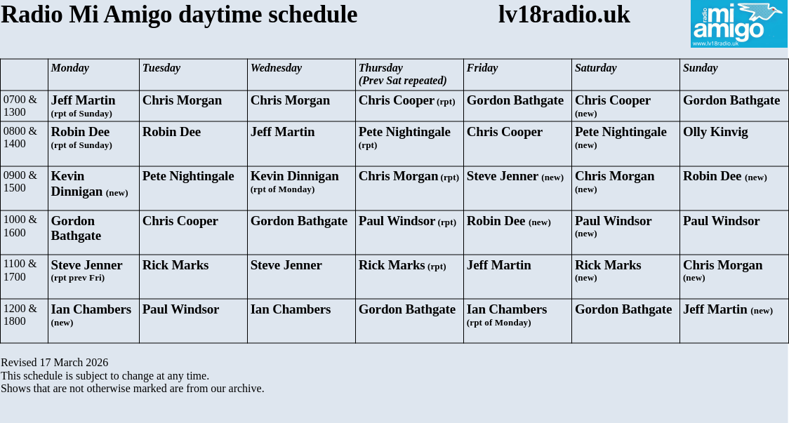 The station uses a six hour repeating block system so that a show at 0700 will also be heard at 1300, and a 2200 show will also be heard at 0400.