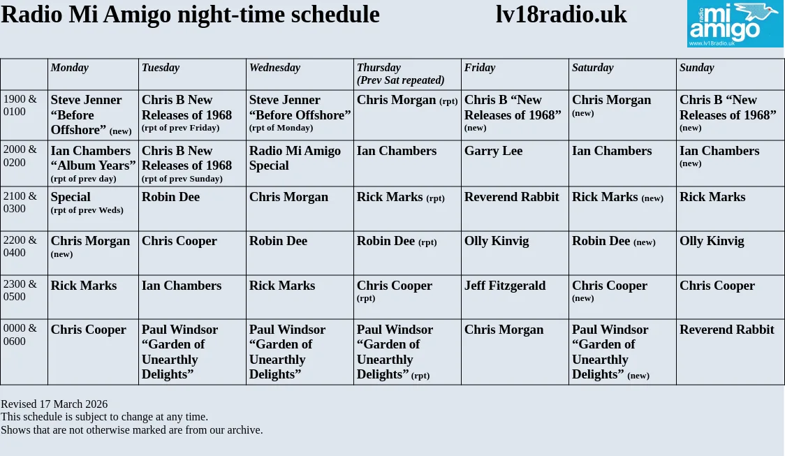 At various times during the year we also have live weekends when a team of presenters, including guests, descend onto the LV18. Typically our Friday to Sunday schedules are disrupted during those weekends. Watch the latest news on here and on our socials for details of the live events.